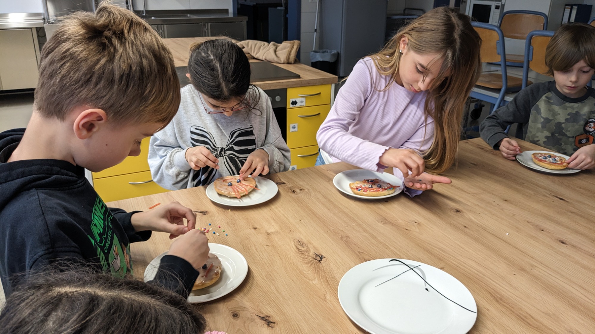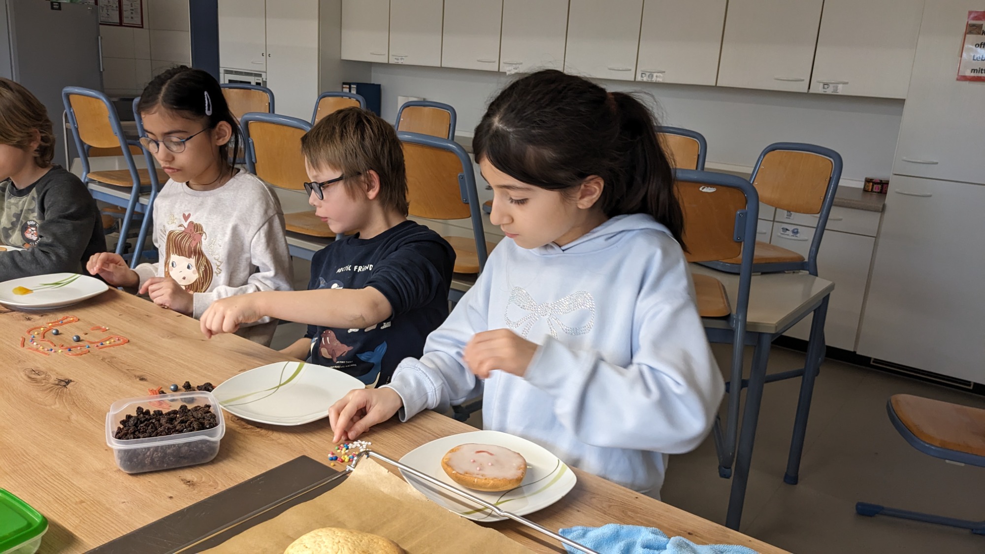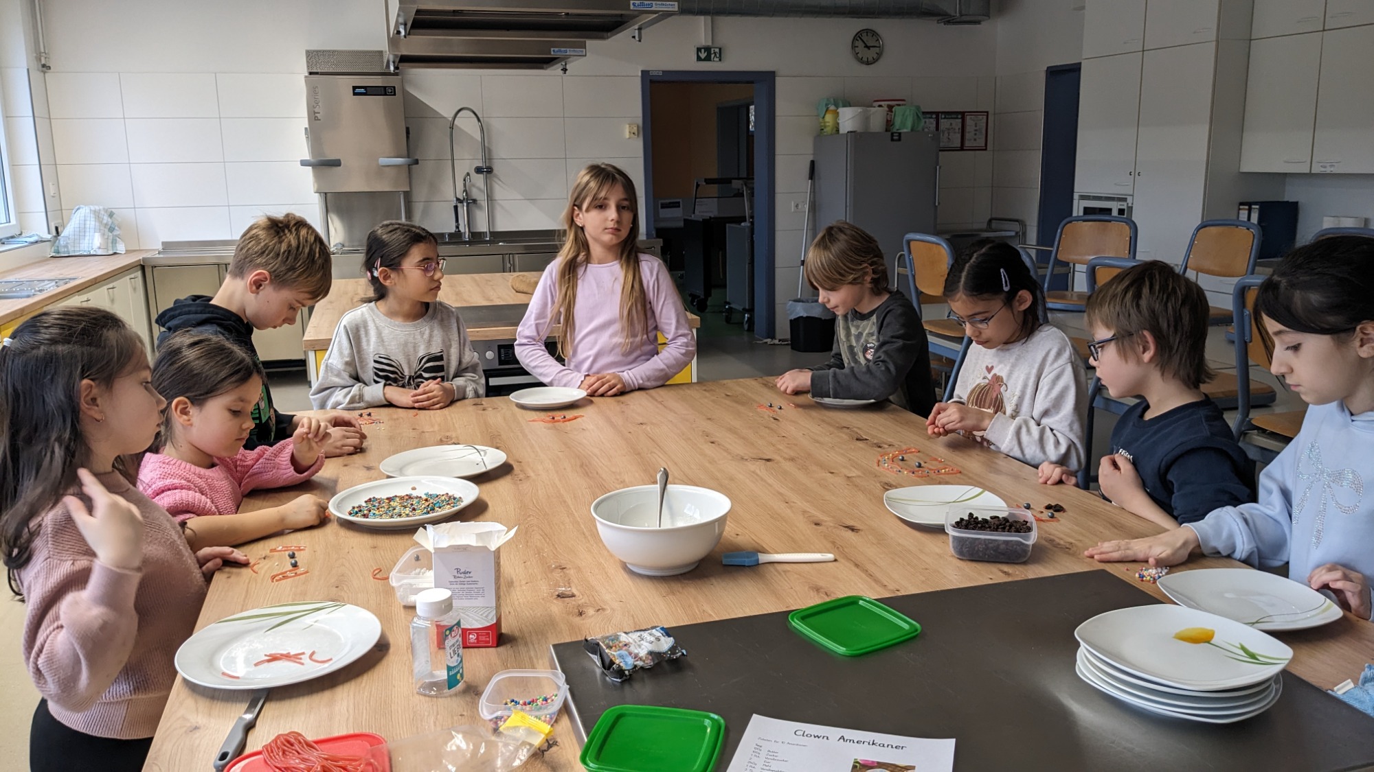 Im Rahmen der Ganztagesbetreuung wollten die Kinder endlich wieder in die Küche. Gesagt, getan. Die Zutaten wurden sorgfältig abgewogen und der Teig angerührt. Daraus formten wir Amerikaner, sodass jeder gleich groß war. Solange die Amerikaner im Ofen waren, bereiteten wir alles für die lustige Verzierung vor. Der Zuckerguss wurde angerührt, bunte Streusel und Erdbeerschlangen bereitgestellt, und dann hieß es: Wer kann das lustigste Gesicht gestalten?