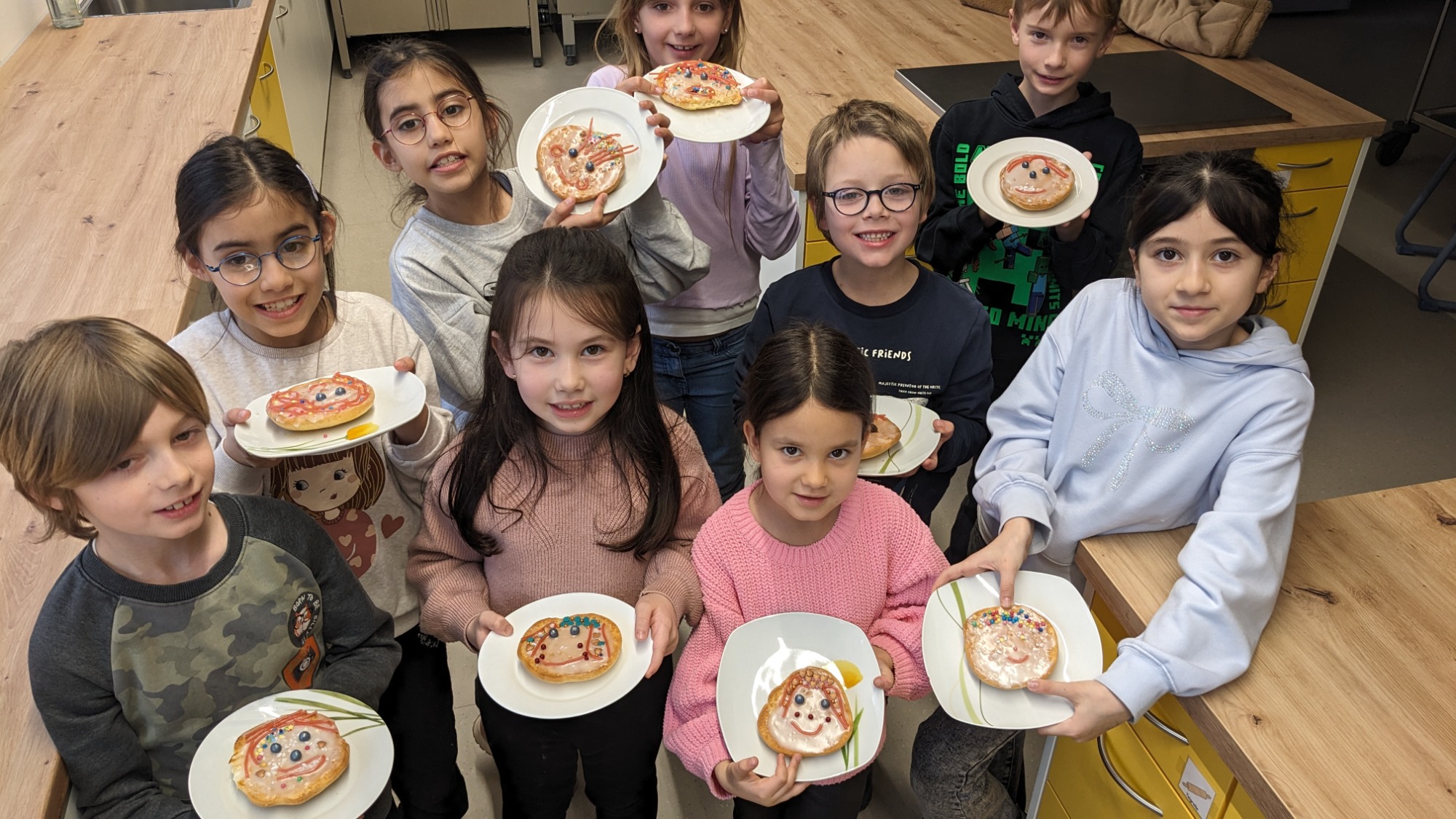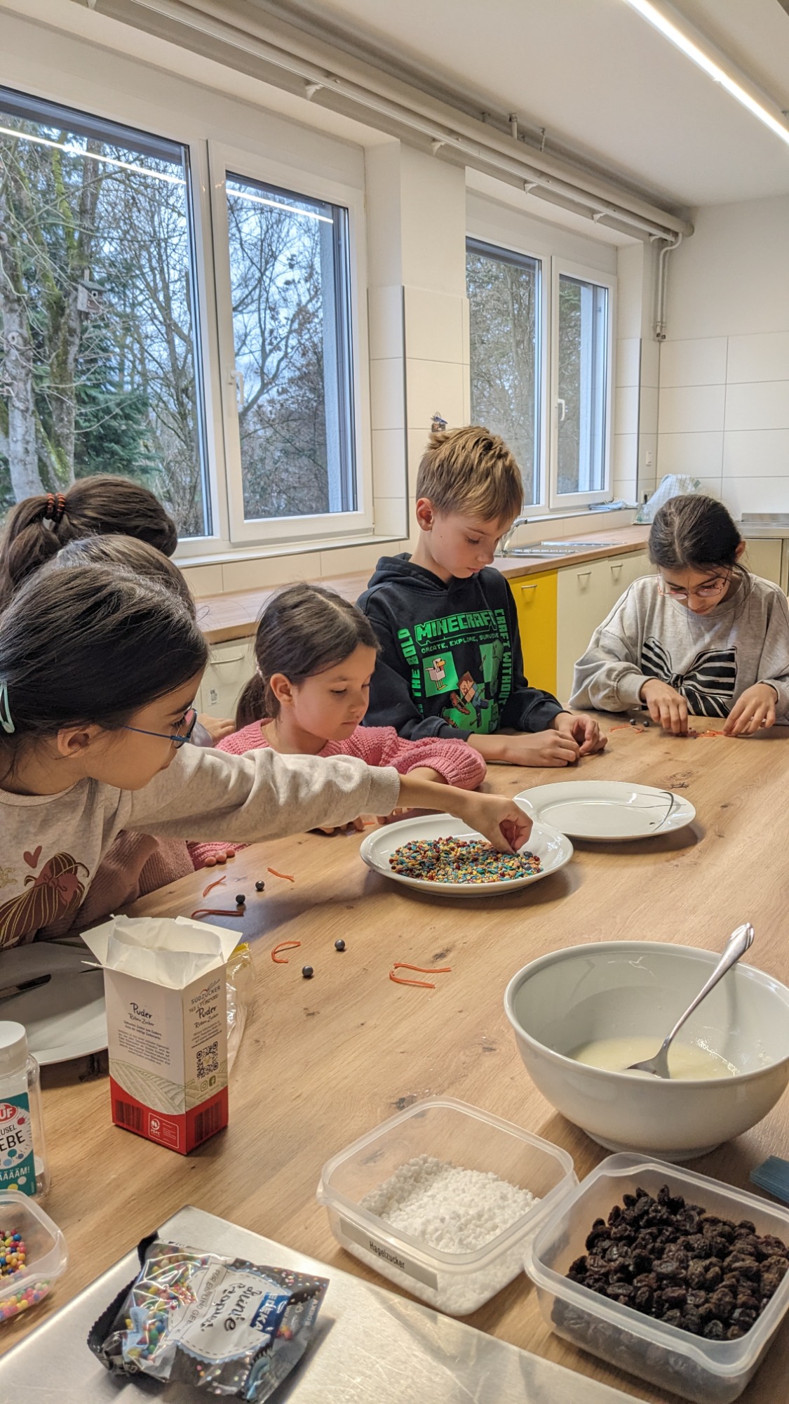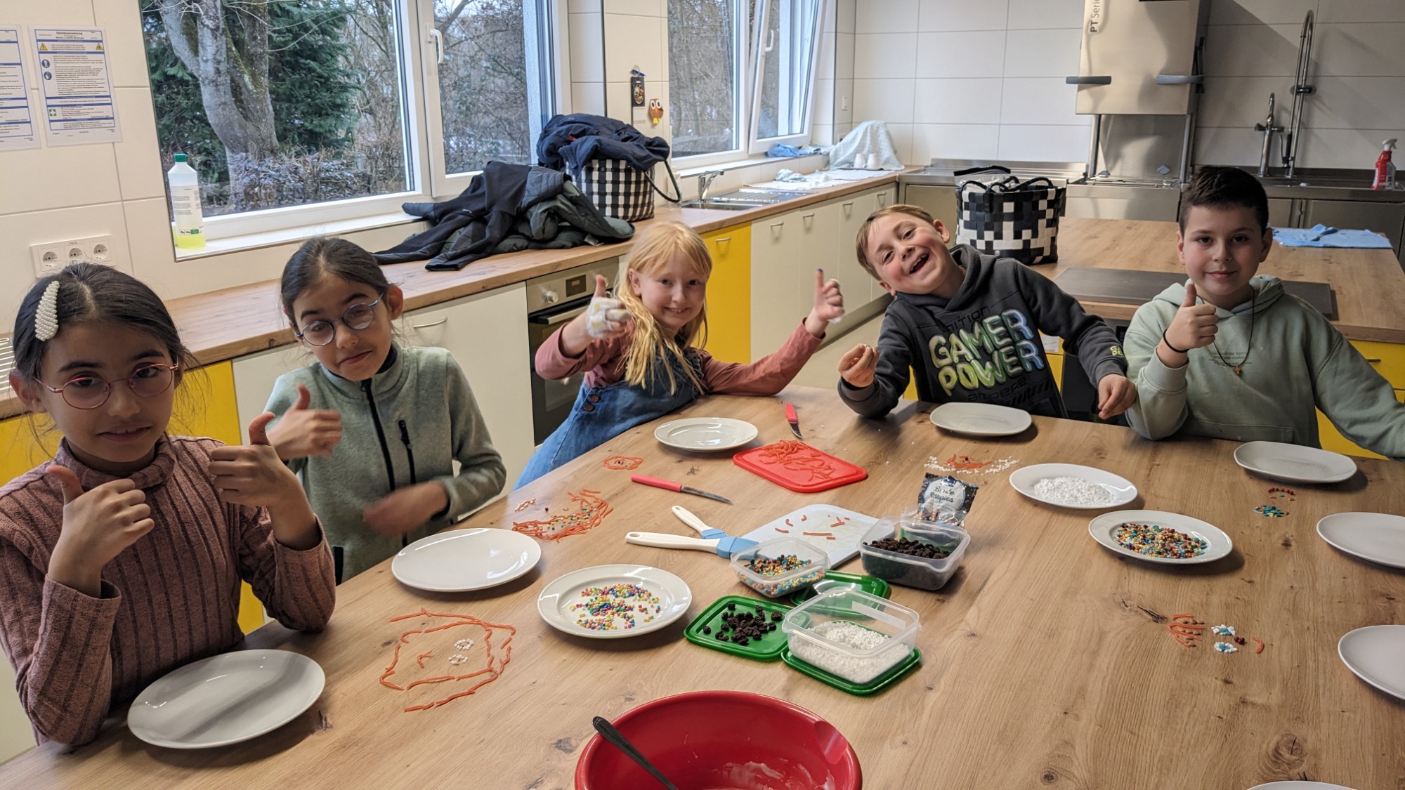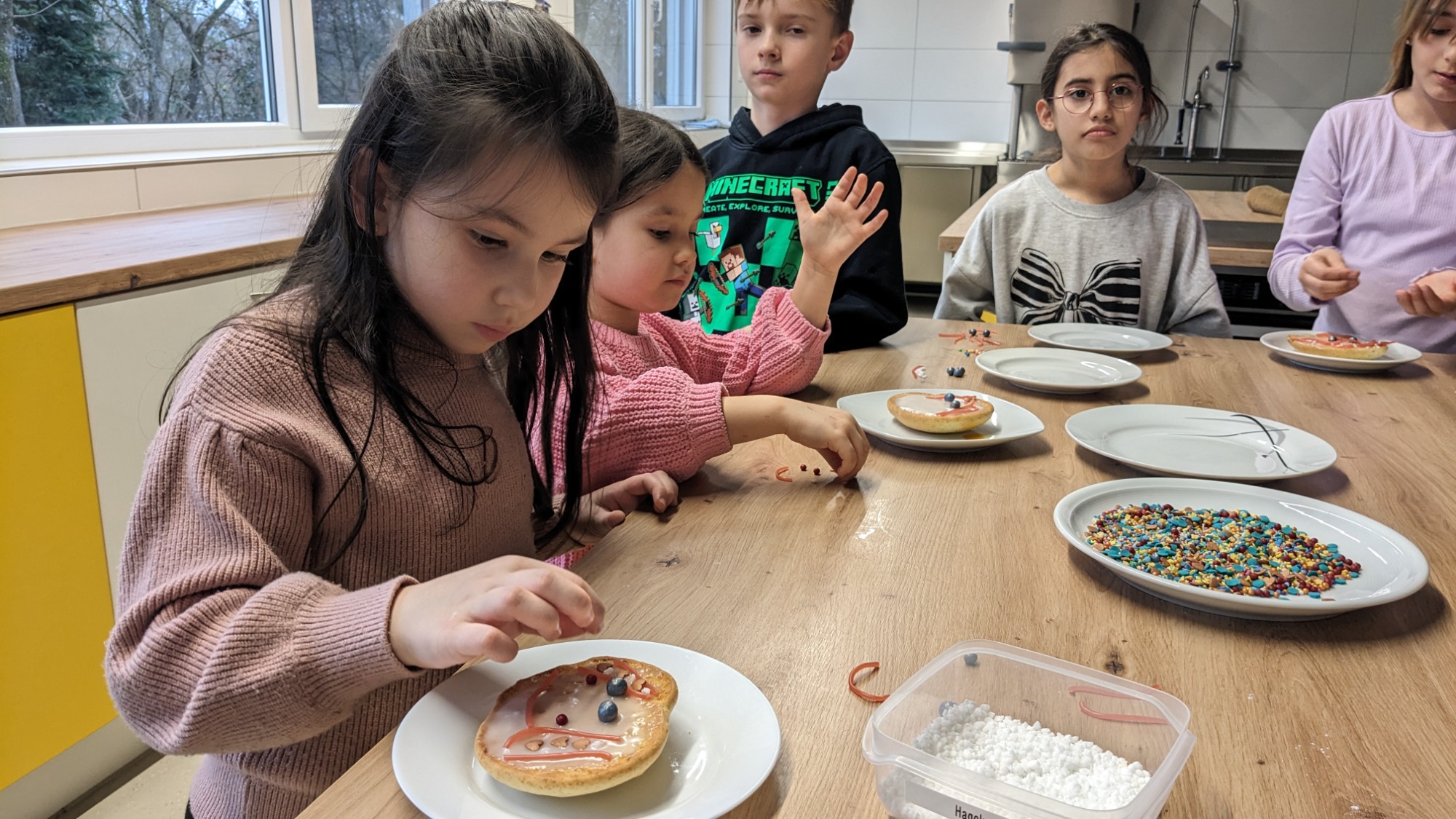 Im Rahmen der Ganztagesbetreuung wollten die Kinder endlich wieder in die Küche. Gesagt, getan. Die Zutaten wurden sorgfältig abgewogen und der Teig angerührt. Daraus formten wir Amerikaner, sodass jeder gleich groß war. Solange die Amerikaner im Ofen waren, bereiteten wir alles für die lustige Verzierung vor. Der Zuckerguss wurde angerührt, bunte Streusel und Erdbeerschlangen bereitgestellt, und dann hieß es: Wer kann das lustigste Gesicht gestalten?